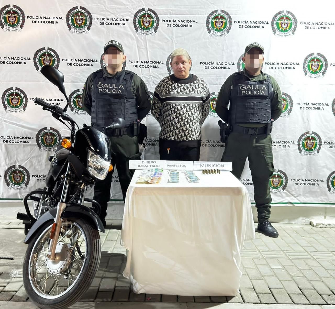 Alias “Jesús” fue capturado en flagrancia por el GAULA mientras presionaba a comerciantes con amenazas y panfletos intimidantes. En el operativo le incautaron dinero, munición y una motocicleta.