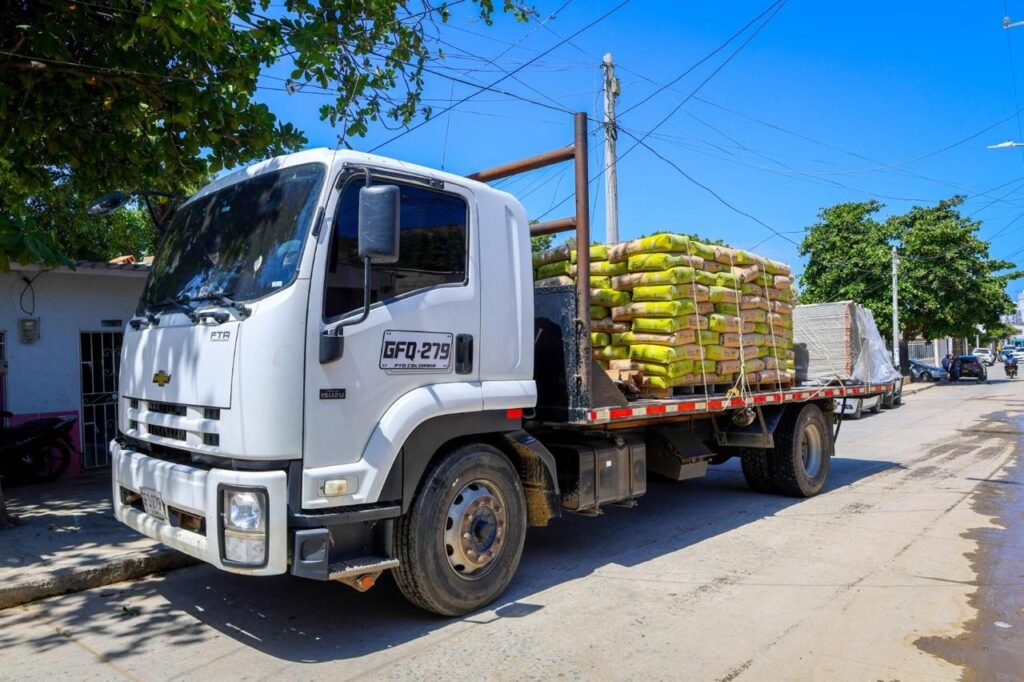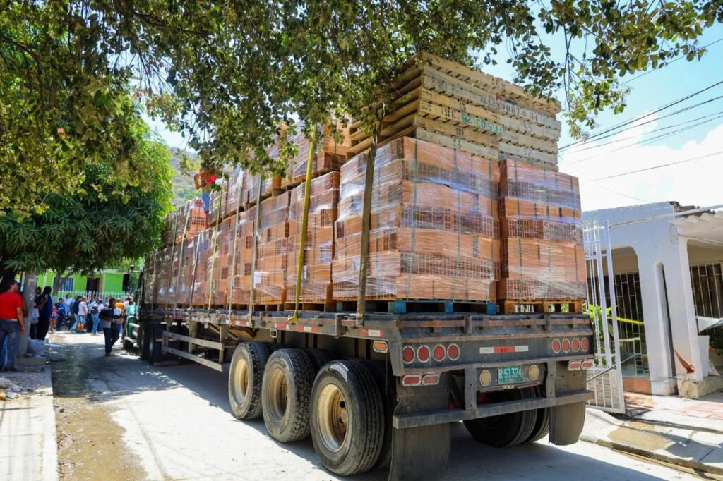 No fue una visita más. Fueron tractomulas cargadas con siete mil bloques, 250 bolsas de cemento, 250 tejas de Eternit y 70 metros de arena. Insumos que marcan el inicio de la recuperación física de las viviendas.
