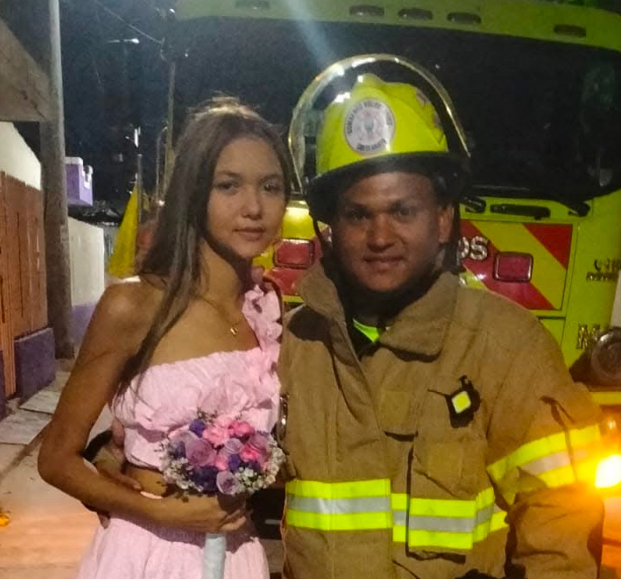 En medio de su turno, bombero samario sorprende a su hija con flores en su quinceañero