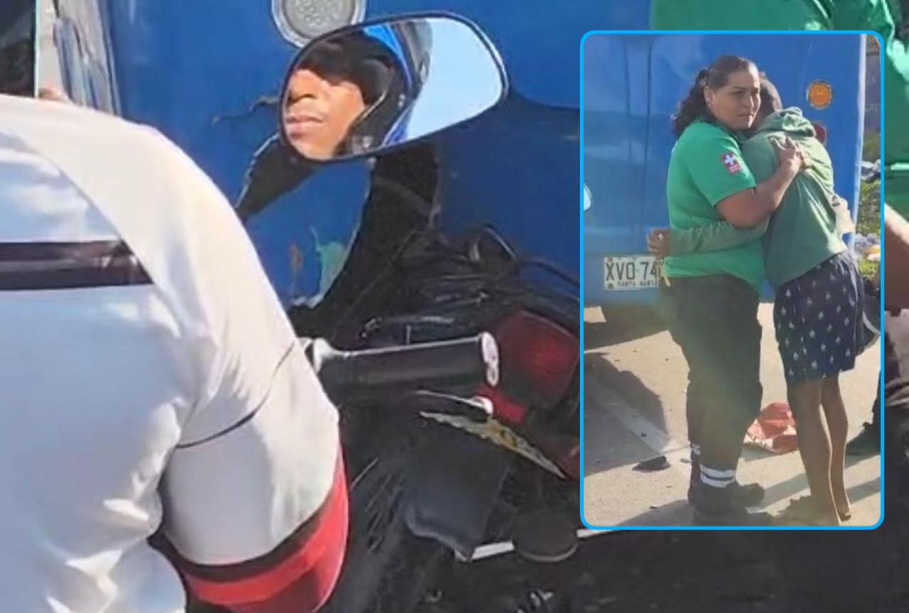 Motociclista se salvó de milagro en accidente de su moto con buseta y abrazó a la paramédico