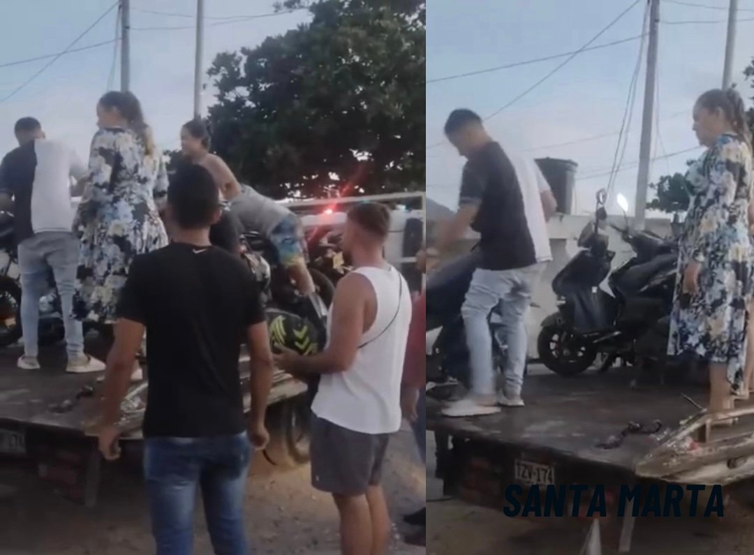 Ciudadanos bajan sus motos de una grúa en Santa Marta antes de ingresar a los patios
