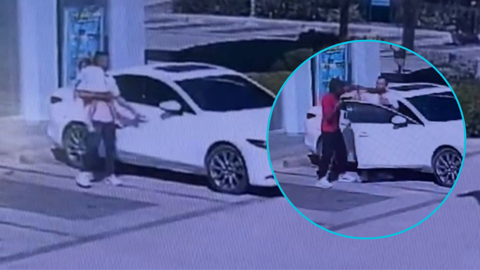 Cuando finalmente el padre aparece cargando a su hija en brazos y se dirige a su vehículo, el delincuente se acerca rápidamente.