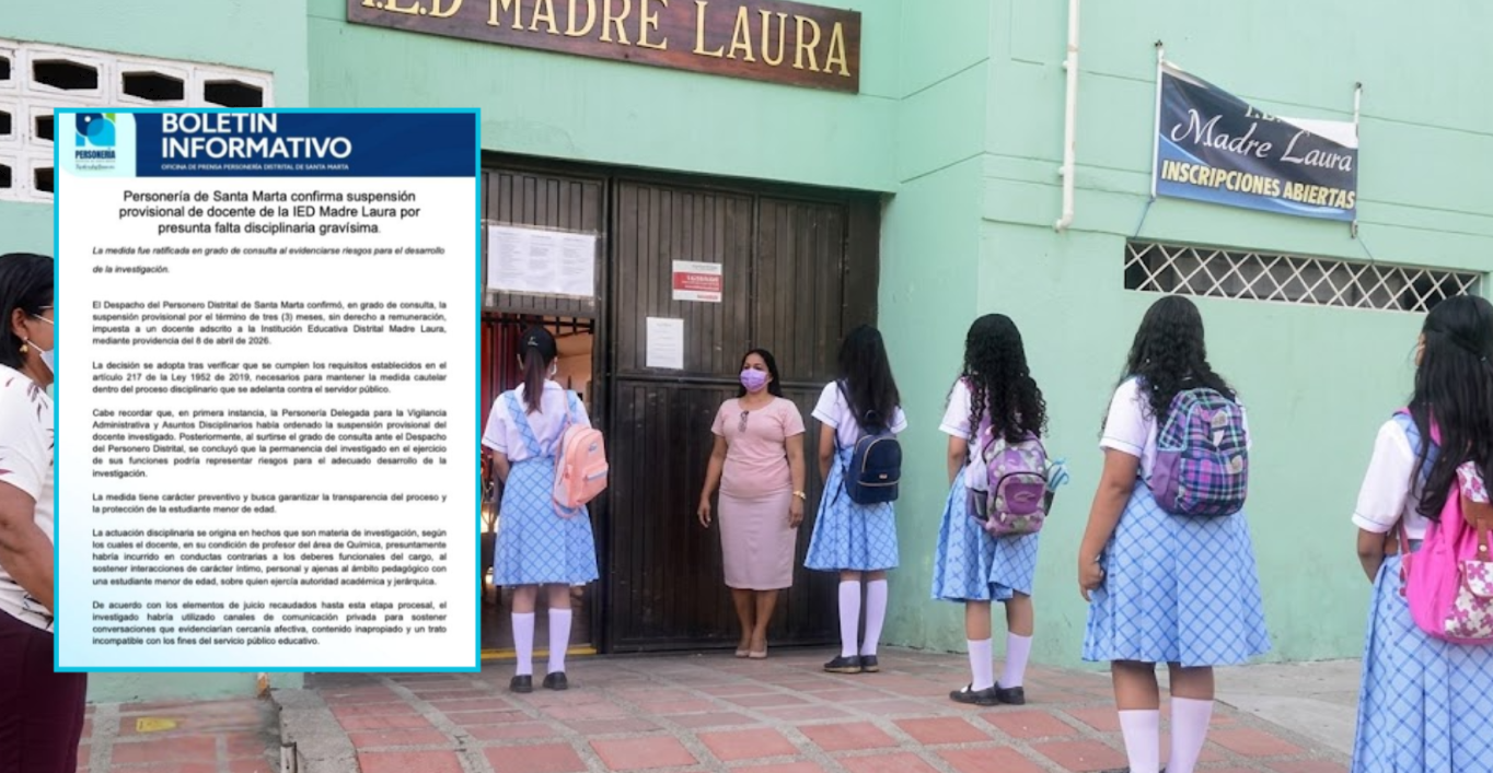 La Personería Distrital de Santa Marta confirmó la suspensión provisional, sin derecho a remuneración y por un periodo de tres meses, de un docente vinculado a la IED Madre Laura, como medida cautelar dentro de un proceso disciplinario en curso por presuntas conductas irregulares con una estudiante menor de edad.