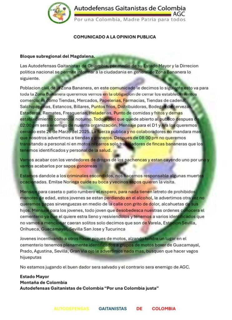 El miedo cierra las puertas de negocios en la Zona Bananera: Clan del Golfo lanza nueva amenaza en panfleto
