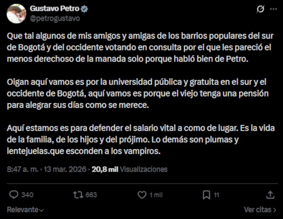 Fue precisamente esa votación la que Petro mencionó en su comentario, al referirse a personas de barrios populares que habrían votado por quien consideraban “el menos derechoso” dentro del grupo de candidatos.
