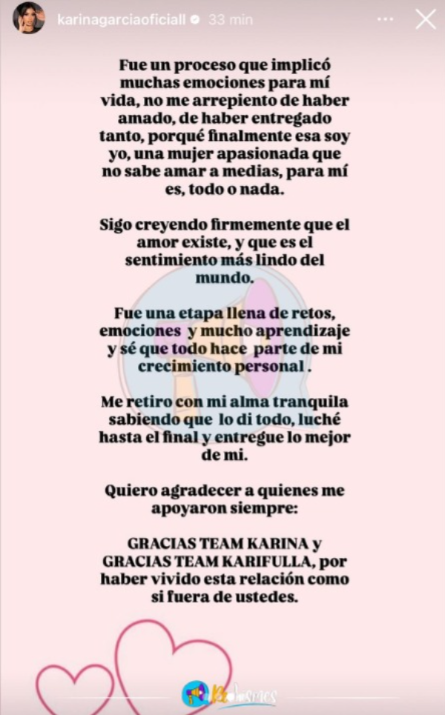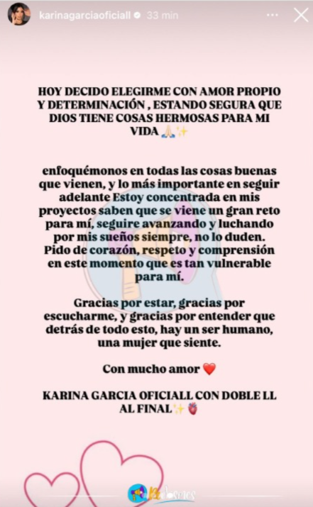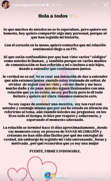 Finalmente, Karina García decidió pronunciarse con un extenso comunicado en sus historias de Instagram, en el que confirmó el fin de su relación sentimental.