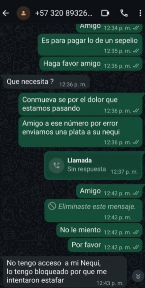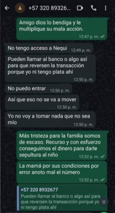 Al darse cuenta, la familia revisó la transacción, identificó el número equivocado e intentó contactar a quien recibió los recursos. Le explicaron la situación, le pidieron que por favor devolviera el dinero destinado al entierro del niño.