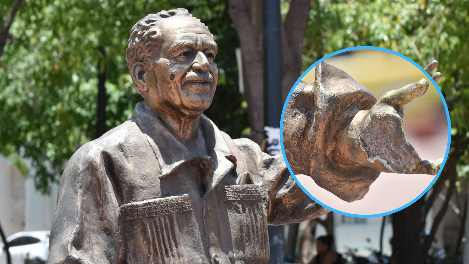 La escultura de Gabriel García Márquez apareció con parte de sus manos destrozadas. En específico, varios de sus dedos fueron arrancados, dejando bordes irregulares en la estructura y una imagen incompleta del escritor. La mutilación es evidente incluso a distancia. La indignación también.
