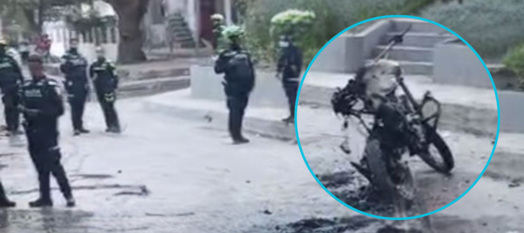 En medio del caos, los atacantes fueron más allá. Una de las motocicletas oficiales fue incendiada en el lugar, reducida a chatarra frente a la mirada de quienes presenciaban el enfrentamiento.