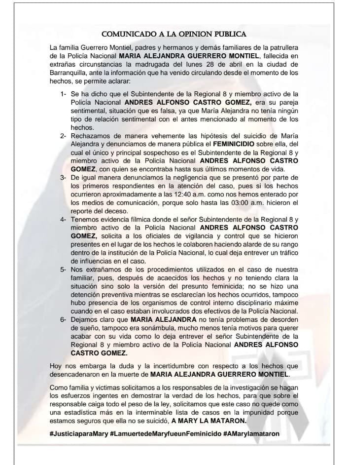 Con un comunicado contundente, la familia de la patrullera María Alejandra Guerrero Montiel desmiente que su ser querido se haya quitado la vida y señala como principal sospechoso al subintendente Andrés Alfonso Castro Gómez, quien estaba con ella la noche del hecho.