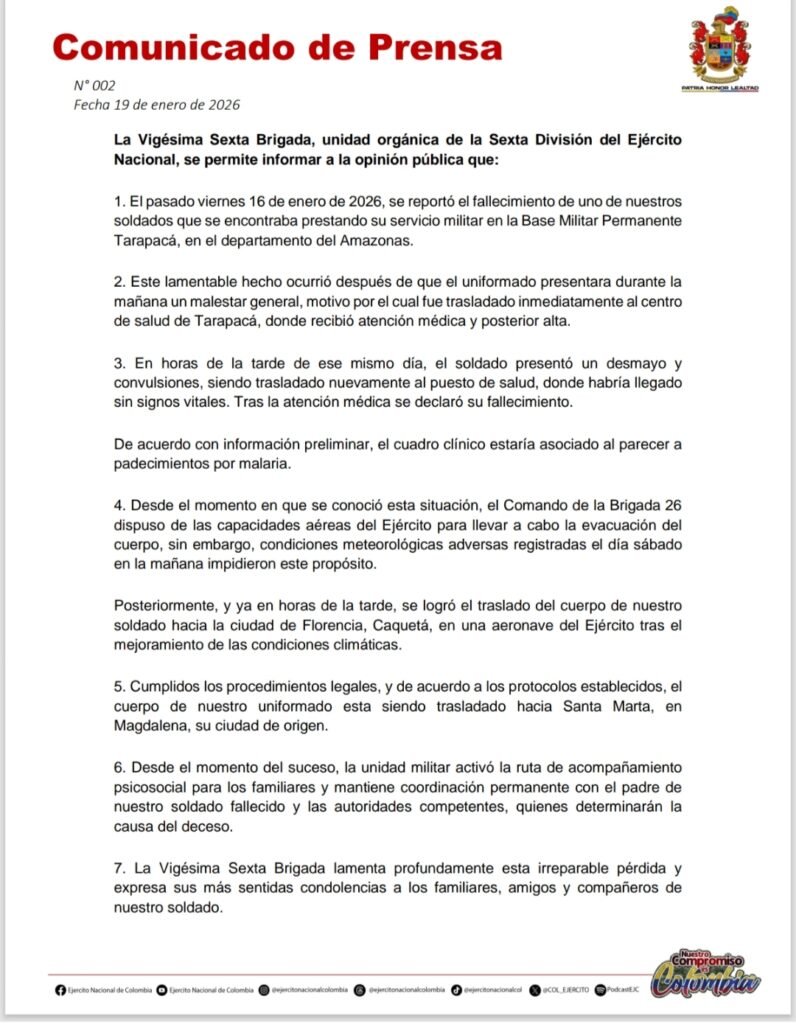 Ante la presión pública, la Vigésima Sexta Brigada del Ejército Nacional emitió un comunicado en el que informó que el soldado presentó un malestar general, fue atendido en el centro de salud de Tarapacá y dado de alta.