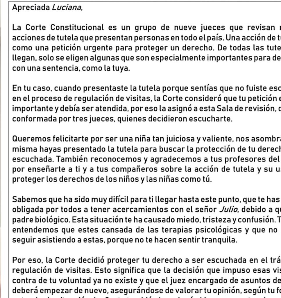 Para la Corte, el gesto de Luciana fue una muestra de madurez y valentía. Sus palabras escritas a mano no solo defendían su derecho personal, sino que abrían la discusión nacional sobre cuánto y cómo escuchamos a los niños en decisiones que afectan su vida emocional y familiar.