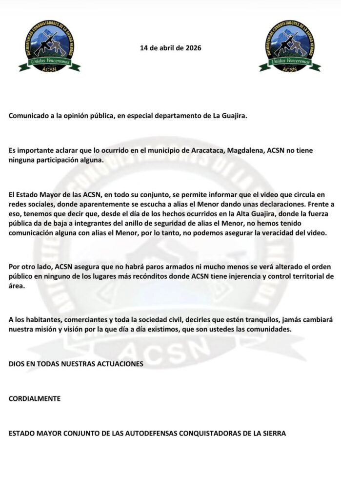 La advertencia de un paro armado en La Guajira, atribuida a Nain Pérez Toncel, quedó en entredicho. Las Autodefensas Conquistadores de la Sierra Nevada (ACSN) salieron a desmarcarse del video que circula en redes sociales y que ha sembrado temor en varios municipios del departamento.