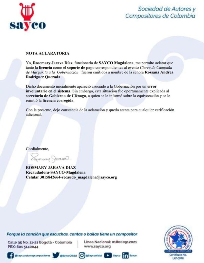 La campaña de Margarita Guerra reaccionó de inmediato y rechazó las acusaciones. Señalaron que el pago que Noya presentó como prueba no pertenece a la Gobernación, sino a un particular, y se basaron en el comunicado oficial emitido por Sayco, que explicó que la asociación al ente territorial fue un error involuntario del sistema.