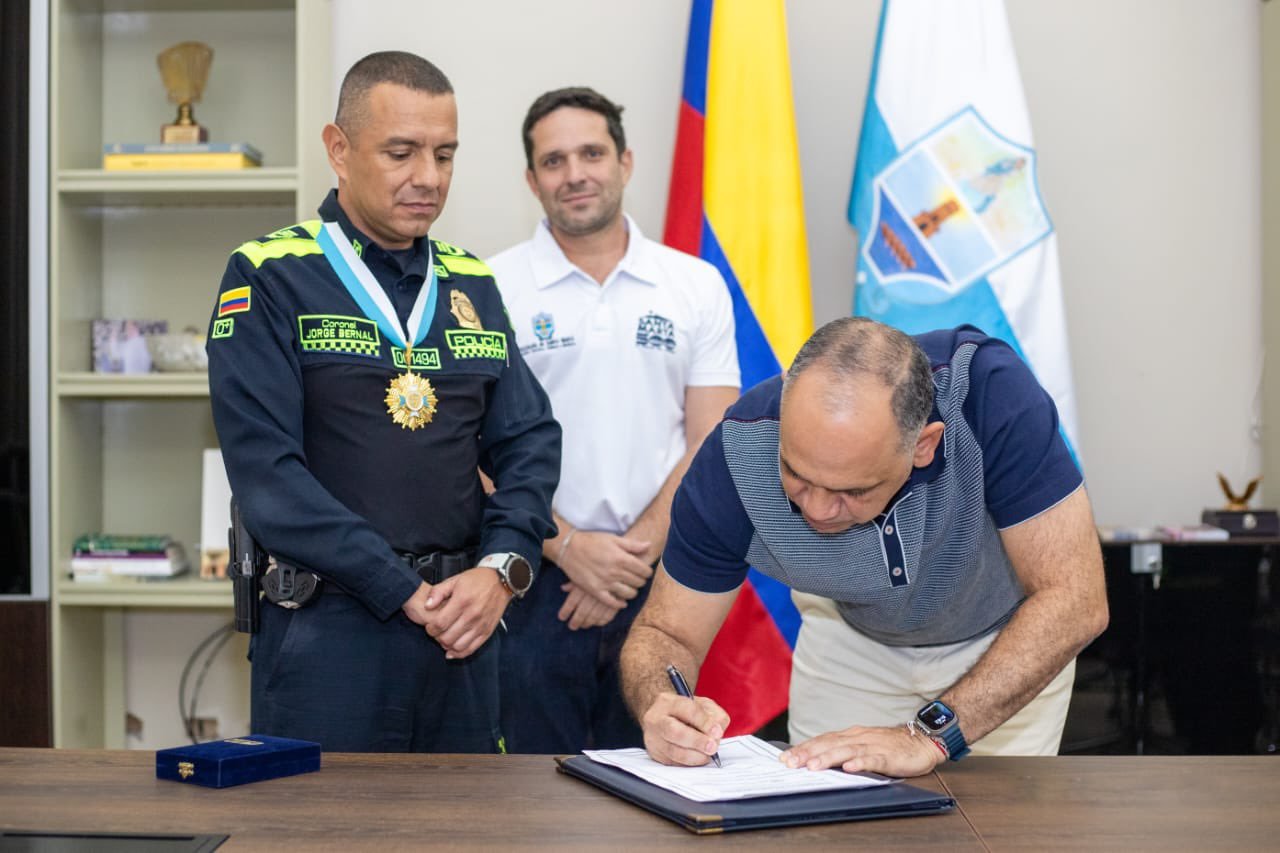 El alcalde de Santa Marta Carlos Pinedo Cuello, entregó al coronel Jorge Andrés Bernal Granada dos importantes condecoraciones como reconocimiento a su labor al frente de la Policía Metropolitana de la ciudad.