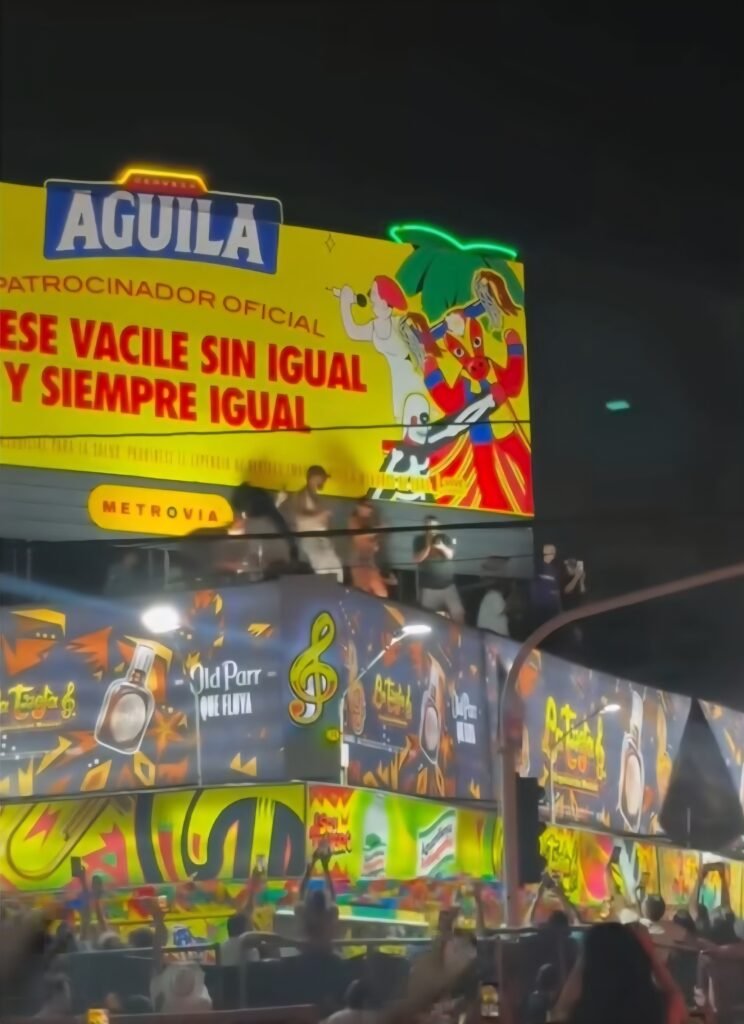 La mezcla resultó explosiva. Beats urbanos chocando con la esencia salsera del lugar, reguetón y dancehall dialogando con el espíritu carnavalero. Desde abajo, la imagen parecía diseñada para viralizarse: dos artistas sobre un techo histórico y miles de voces coreando al mismo tiempo.
