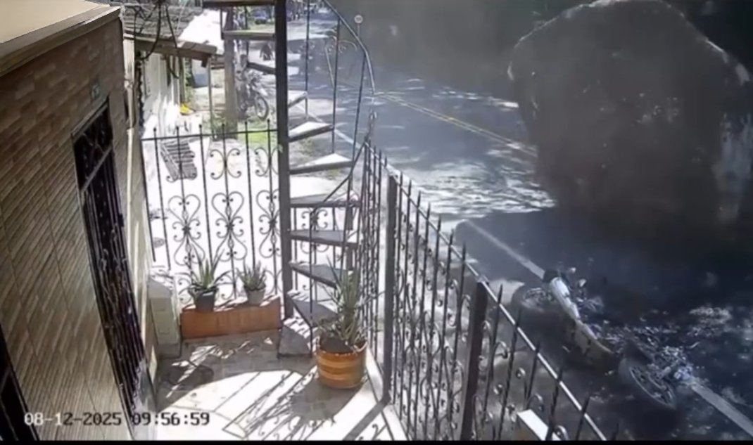 Las cámaras de seguridad captaron la escena: el motociclista detiene la moto, la deja a un lado de la carretera y corre junto a su acompañante en busca de un lugar seguro. No pasan más de tres segundos cuando la roca cae con fuerza sobre el vehículo y lo convierte en chatarra. La reacción rápida les salvó la vida.