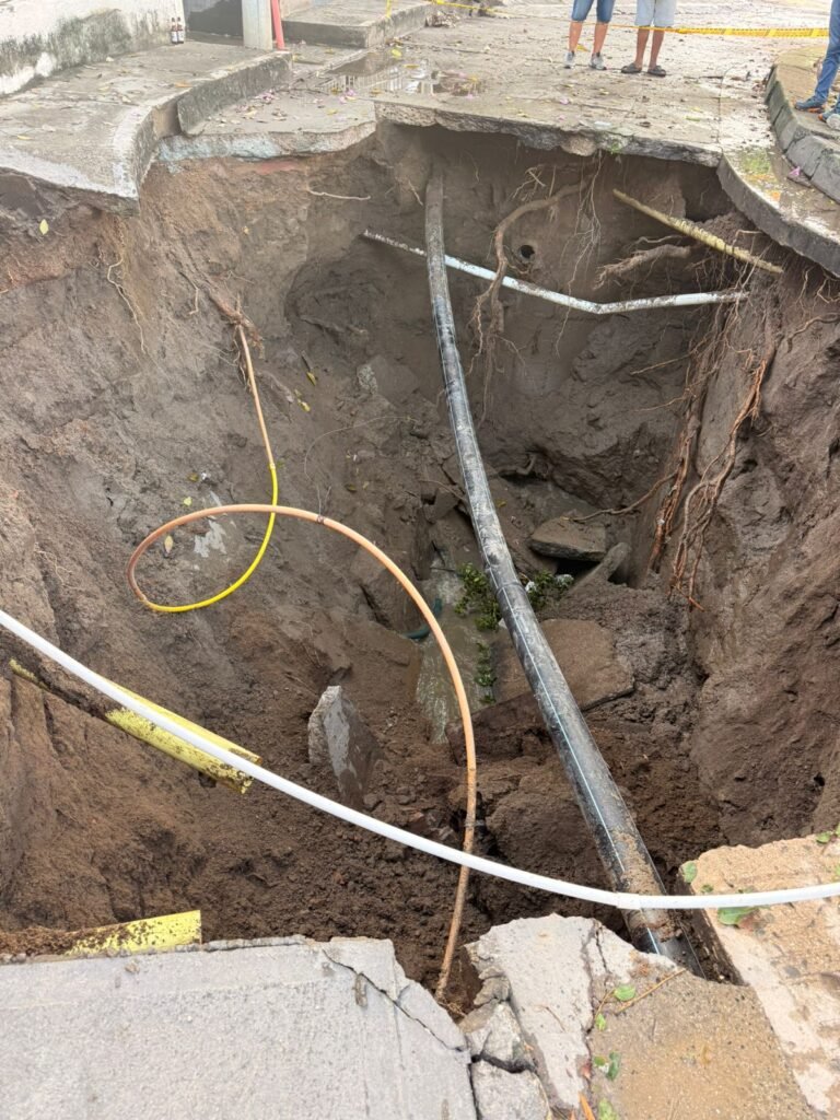 El diagnóstico técnico no deja dudas: la socavación del suelo está asociada a filtraciones de aguas residuales por tuberías deterioradas, sumada a una deficiente compactación del terreno durante la construcción de la urbanización. El tránsito constante de vehículos pesados, como camiones de basura o carrotanques, ha terminado de acelerar la fractura del pavimento.