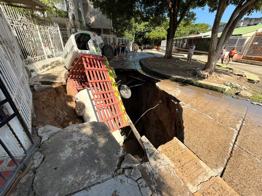 El suelo volvió a ceder en Villas de Alejandría, una urbanización de estrato 4 ubicada en el suroriente de Santa Marta. El colapso de la vía principal dejó un enorme cráter que engulló un camión cisterna que distribuía agua en la zona. El conductor, con golpes leves, logró escapar del vehículo antes de que quedara atrapado entre placas de concreto y tierra removida.