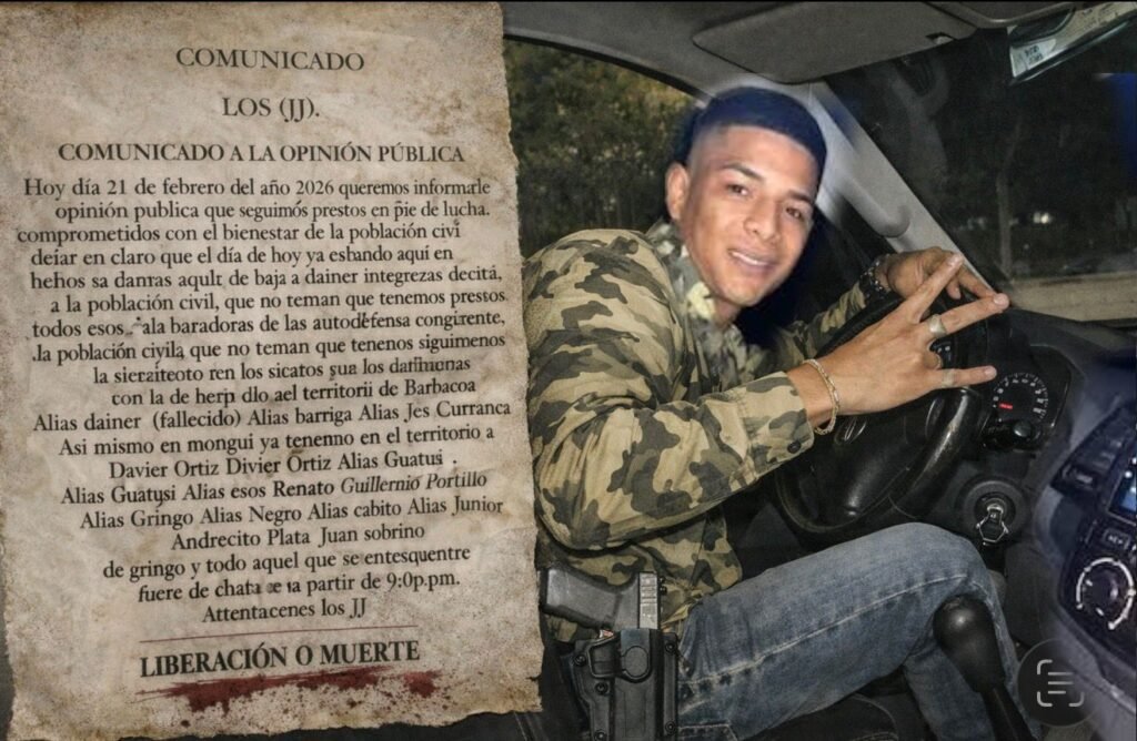 En el documento, firmado por Los JJ y fechado el 21 de febrero de 2026, el grupo armado se atribuyó el crimen y dejó explícita su intención: iniciar una “limpieza” para sacar del territorio a las ACSN.