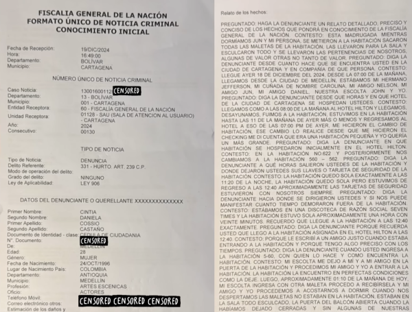«Se nos metieron a la habitación en uno de los hoteles más exclusivos de Colombia. Nos robaron el equivalente a 120 millones de pesos…se llevaron hasta la ropa interior sucia», relata Cossio en un video, en el cual presenta las denuncias ante la Fiscalía.
